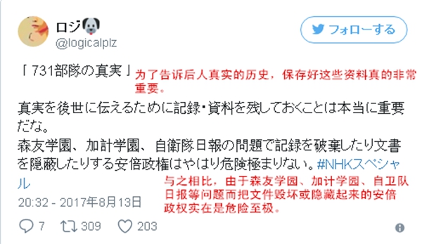 不仅如此,多名日本网友表示,日本民众甚至大部分都不知道731部队是怎么回事。因为尽管人类历史上,“731”这个词,是与恐怖、魔鬼、惨无人道、灭绝人寰等字眼联系在一起的,日本政府却一直拒绝承认这一段泯灭人性的历史。京都大学医学部资料馆原本曾布置过关于731部队细菌战的展板,但没多久就被撤走了。日军731部队“细菌战”的中国受害者家属曾欲赴日,却被日本政府拒绝发放签证。推动日中和解的民间努力,因日本外务省滥用权力而遭到阻碍。
