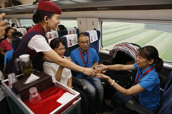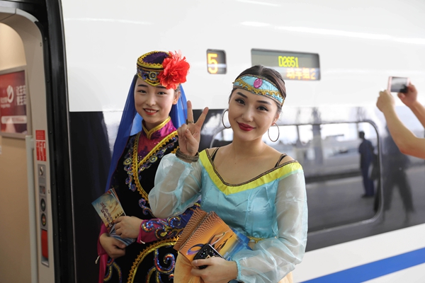 2017年7月9日,宝兰高铁首日通车,身着民族服饰的工作人员在欢迎旅客上车
