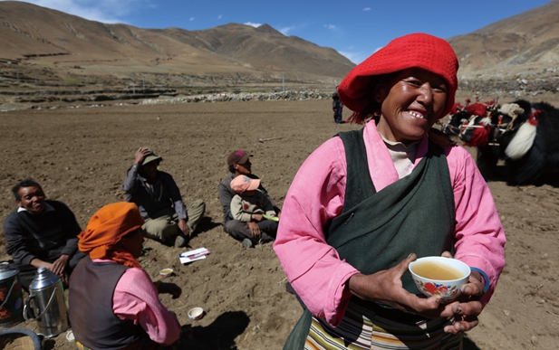西藏自治区日喀则地区南木林县,即将结束一天辛苦劳作的藏民们集中在一起喝青稞酒