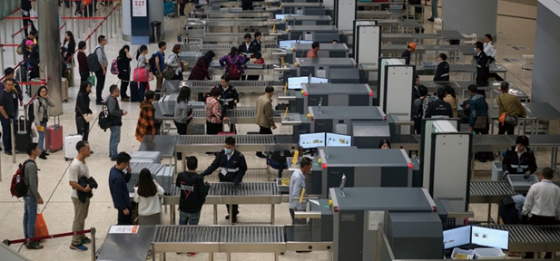 乘客正在高铁香港西九龙站安检柜台接受安检