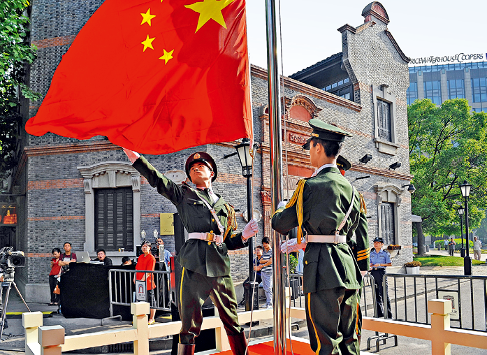 上海,中共“一大”会址纪念楼前的升旗仪式