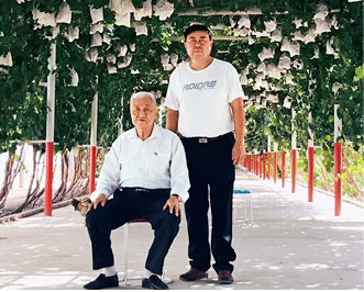 依马木•麦麦提和儿子艾斯卡尔•依马木在柯柯牙生态园区的葡萄架下合影。30多年前,这里还是一片荒漠