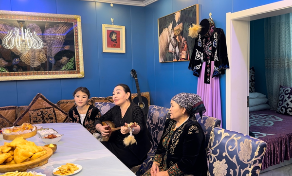 在“马背之家”民宿,可可托海镇文体专干、塔拉特村游客服务中心负责人娜孜古丽·拉孜旦用传统民族乐器冬不拉演奏《可可托海的牧羊人》 图/刘婷