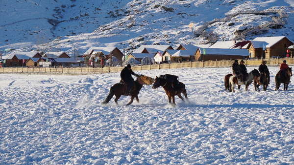 除了建民宿,塔拉特村还新建了一支“功勋马队”,其命名源于可可托海“3号矿脉”的故事,一方面让旅客了解可可托海矿区建设的艰辛岁月,另一方面为游客提供休憩、骑行观光、民俗文化活动表演等服务。“功勋马队”还将传统与现代冰雪活动相结合,在骑马观光、马拉爬犁等体验活动的基础上,增加了叨羊、姑娘追等传统文化表演,让游客体验冰雪乐趣的同时,体验哈萨克民俗文化魅力。