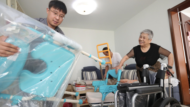 2023年10月16日,工作人员正在88岁的天津市劳动模范(右)家中安装养老设备
