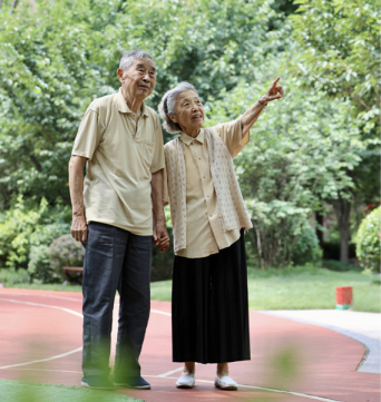 老年夫妻在健步道欣赏景色,脸上洋溢着幸福的笑容