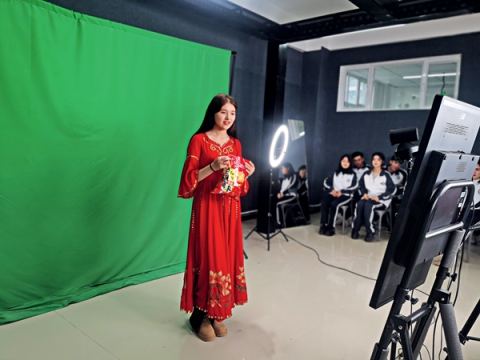 哈尼克孜·阿布力米提正在智能直播间模拟直播带货 图/杨双双