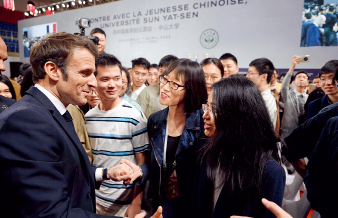 2023年4月7日,广州,法国总统马克龙(左)在中山大学与中国学生见面并交谈