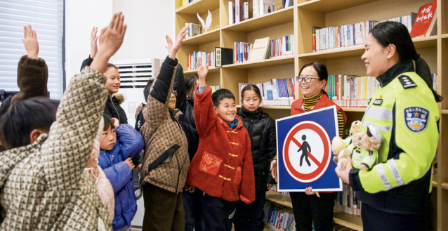 2024年2月15日,江苏南通,在如皋市城南街道肖陆村农家书屋内,学生们争相抢答交通安全知识问答