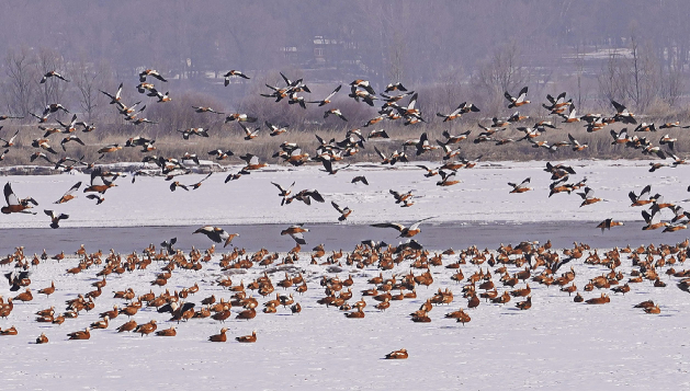 严寒冬日,黄河准格尔段小滩子村飞来大批赤麻鸭,它们时而在空中盘旋徘徊,时而在水面嬉戏觅食,成为冬日里一道靓丽的风景线。