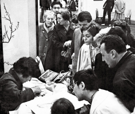1966年5月27日,中国展品在巴黎博览会受到观众欢迎。图为刺绣表演的现场