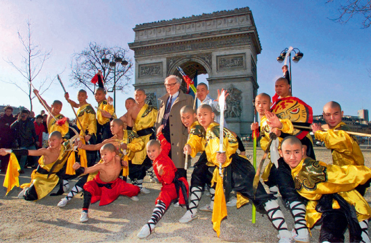 2001年12月13日,巴黎,时装设计师皮尔·卡丹(中间)与中国武术表演团体在星光广场合影,背景是凯旋门