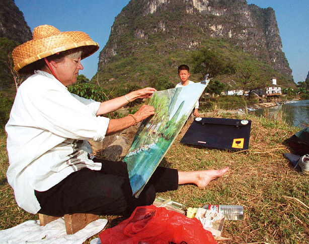 1999年12月10日,一位法国画家在风景如画的漓江岸边作画