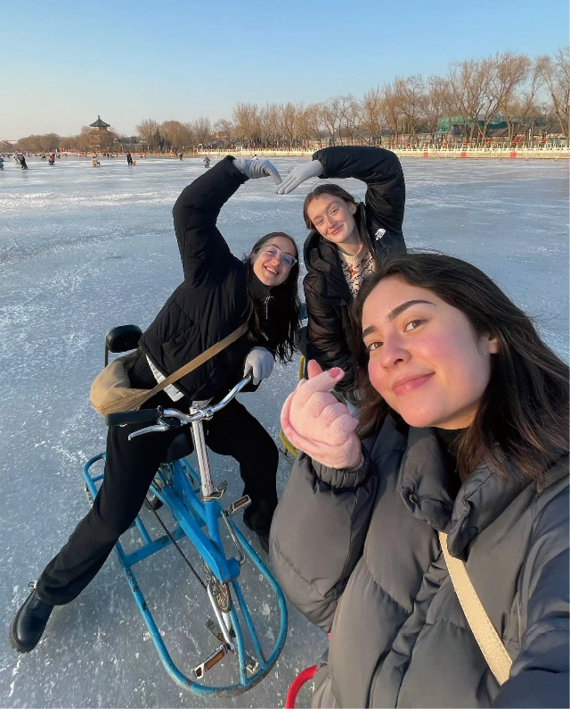 2024年冬天,杨洛林(左一)与朋友在北京什刹海公园体验冰上项目