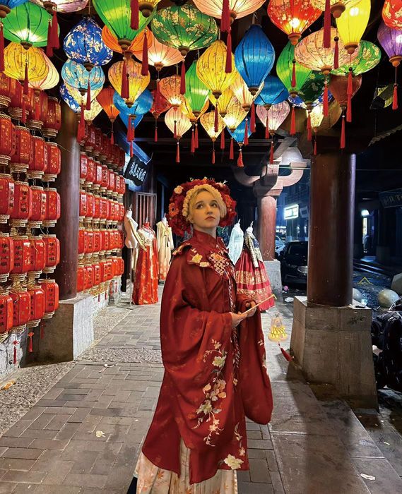 2024年春节期间,梅丽莎换上红色的古装,前往街头参加活动并打卡拍照