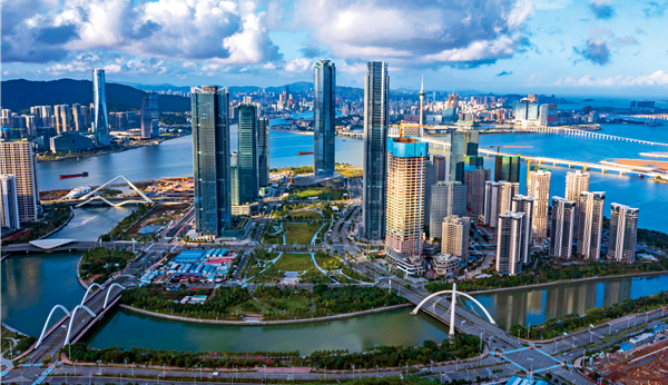 航拍横琴粤澳深度合作区的金融岛建筑群