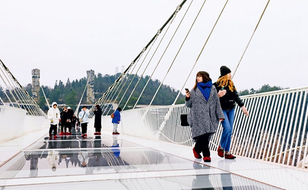 2024年1月26日,外国游客在湖南张家界大峡谷玻璃桥游玩