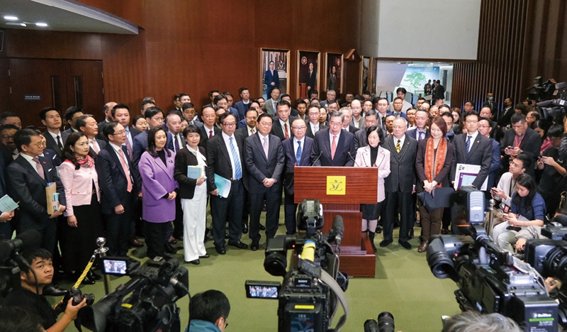 2024年3月19日,香港特区立法会全票通过《维护国家安全条例》。图为立法会议员会见传媒