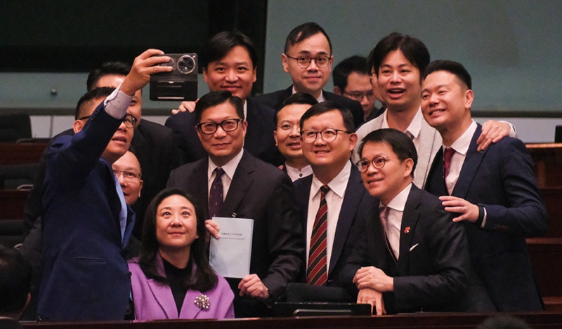 2024年3月19日,香港特区立法会加开会议恢复二读辩论《维护国家安全条例草案》。图为部分立法会议员与香港特区政府保安局局长邓炳强(手持条例草案者)合影
