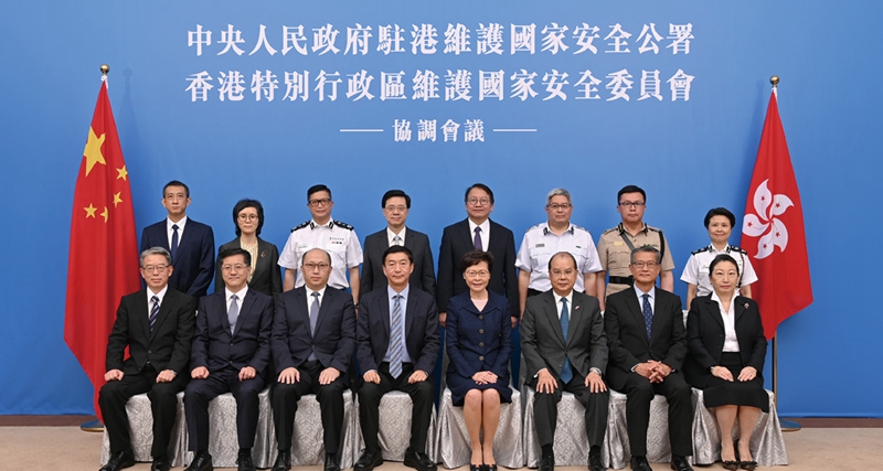 2020年7月31日,邓炳强(后排左三)出席驻港国安公署与香港特区国安委举行的协调会议