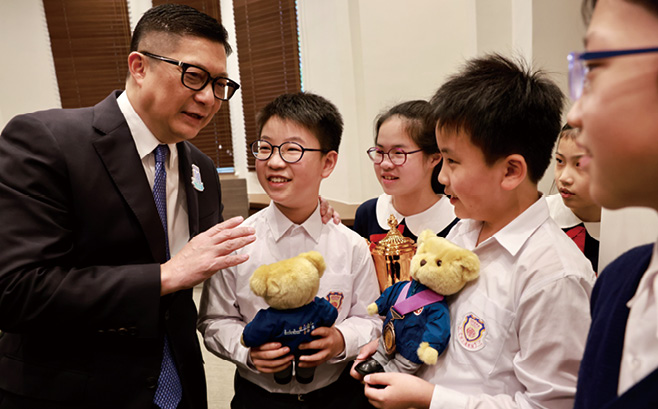 2023年12月3日,邓炳强(左一)在全港学界国家安全常识挑战赛启动礼上同参赛选手交流