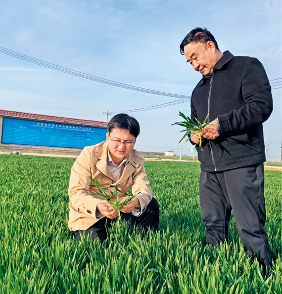 徐淙祥(右)和孙子徐旭东(左)在试验田里查看小麦生长情况