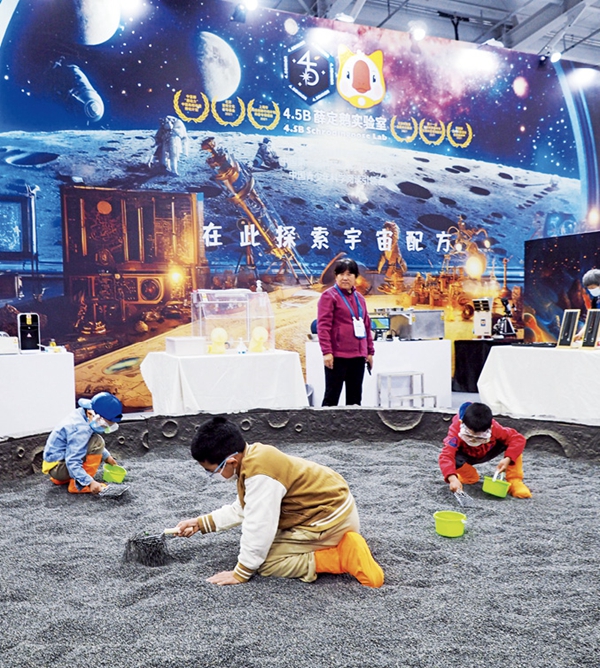在2024科幻大会现场,科学家们用科研成果铺成月球的图案,让来到现场的孩子们可以在“月球”上挖掘。这些月壤里面埋藏了很多宝石,吸引孩子们在玩耍娱乐当中学习太空知识。