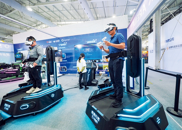2024年4月28日,北京首钢国际会展中心,观众在2024中国科幻大会“潮幻奇遇季”上体验“VR跑步机”