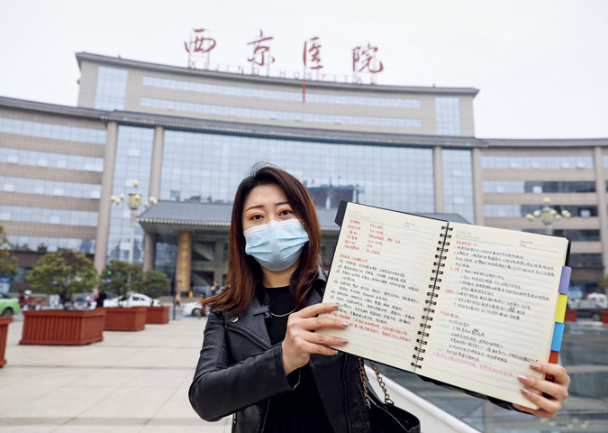陕西西安,西京医院前,陪诊师展示记录着每个医院就诊信息的笔记本