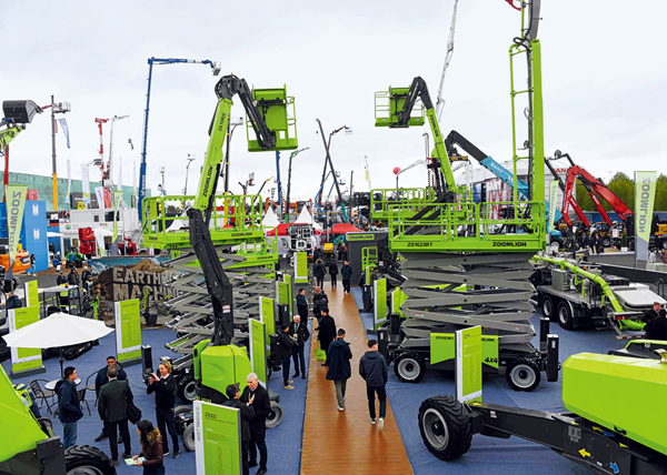 2024年法国巴黎工程机械展(INTERMAT2024)上,中国工程机械行业龙头企业中联重科以“绿色装备,智领未来”为主题,携数十款产品参展。图为当地时间4月24日的中联重科展台
