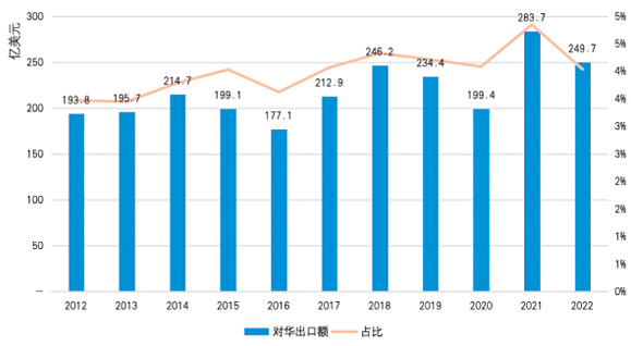 联合国商品贸易统计数据库数据显示,2012-2022年间,法国对中国出口额从193.8亿美元逐步增长至249.7亿美元,年均增长2.6%。其中,2021年的出口额更是达到283.7亿美元。相比而言,法国自中国进口额却由534.6亿美元降至517.5亿美元,年均下降0.3%。最低的2020年仅有411亿美元。