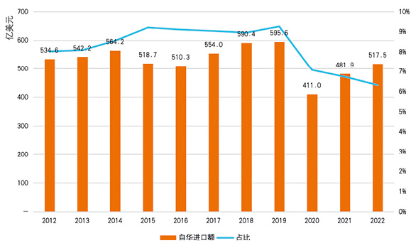 这种变化同样反映在双边贸易在法国对外贸易的占比之中。2012-2022年间,对中国出口额占法国出口总额的比重从3.5%逐渐升至4.0%,2021年曾达到4.8%;同期的自中国进口额占比则在2015-2019年保持9.0%以上后,从8.0%逐步降至2022年的6.3%。
