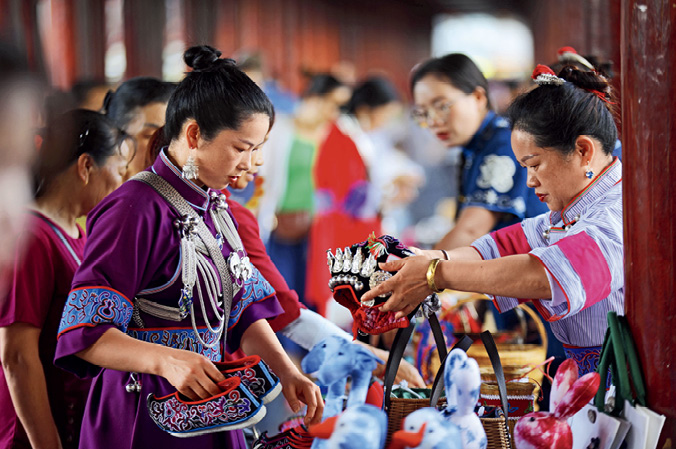 2024年6月11日,黔东南苗族侗族自治州锦屏县“非遗购物节”活动在三江镇赤溪坪风雨桥举行,由当地的非遗企业、工坊及工作室提供的民族服饰、非遗美食、文创工艺品等展销产品,吸引不少群众前来观赏、选购