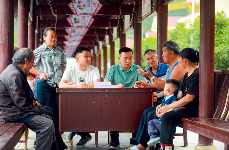 2024年6月18日,贵州黔西永燊彝族苗族乡茨落村,纪检监察干部认真听取群众的意见和建议