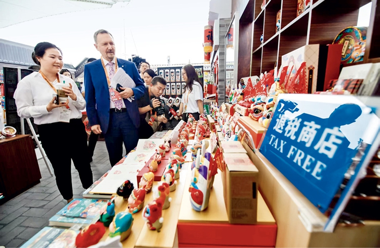澳大利亚游客David(左二)在服贸会上感受中国离境退税“即买即退”的方便快捷