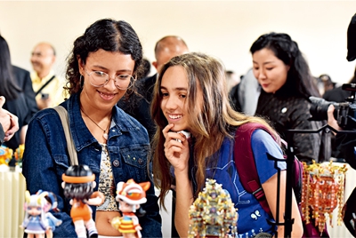 当地时间2025年6月27日,“文明的对话系列活动(金砖专场)”在巴西里约热内卢州立大学举行。两位巴西女大学生在配套举行的“欢朋满粤”岭南文化创新展上,被篮球城市东莞的少女形象潮玩深深吸引