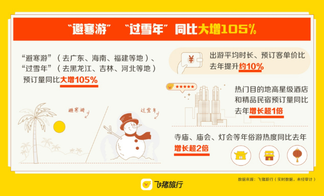飞猪《2024春节假期出游快报》显示,国内游南北流动趋势明显,其中飞往广东、海南、福建等南方地区温暖过年的“避寒游”,以及飞往黑龙江、吉林、河北等北方地区的“过雪年”最为火爆,预订量同比去年增长105%。另外,“古都游”这个假期也备受青睐,预订量同比去年增长115%。