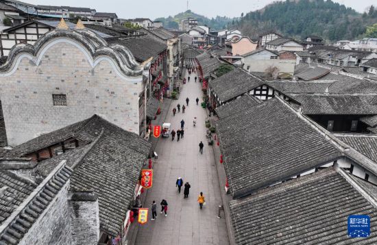 2月27日,游客在重庆潼南双江古镇游览(无人机照片)。