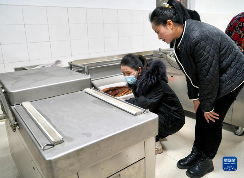 陈贵静在白鹿顶山货加工基地和工人一起包装腊肉礼盒(2月16日摄)。新华社记者 薛晨 摄