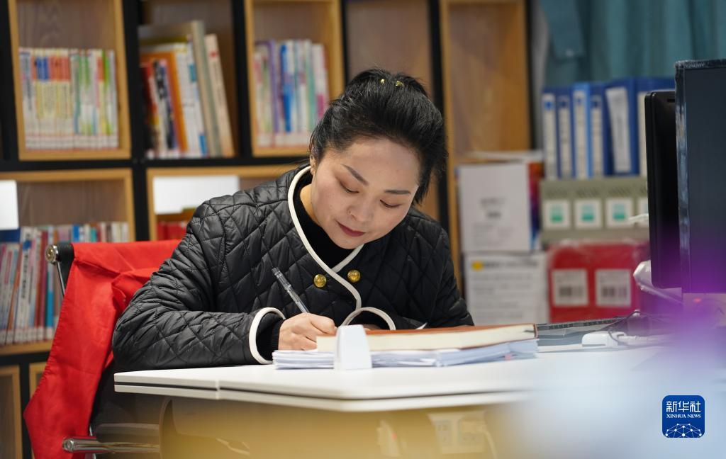陈贵静在四川省彭州市白鹿顶村村委会办公室写材料(2月16日摄)。新华社记者 薛晨 摄