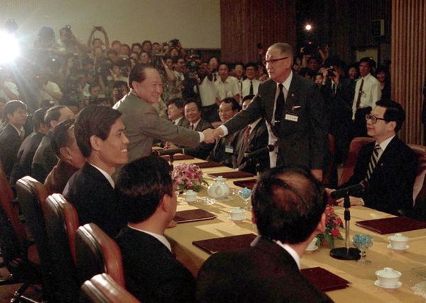 1993年4月27日,海峡两岸关系协会会长汪道涵先生(左)和台湾海峡交流基金会董事长辜振甫先生(右)在新加坡举行海内外备加关注的“汪辜会谈”