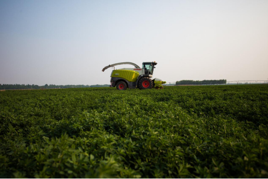 (蒙牛牧场正在收割苜蓿)