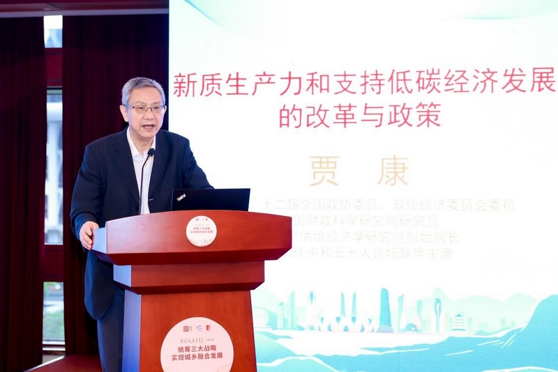 第十一、十二届全国政协委员、政协经济委员会委员,中国财政科学研究院研究员,华夏新供给经济学研究院创始院长,中国碳中和五十人论坛联席主席贾康作题为《新质生产力和支持低碳经济发展的改革与政策》的报告,他对“新质生产力”的概念进行了详细诠释,并对支持低碳经济发展的改革与政策进行了介绍。他认为,“新质生产力”的本质就是优质生产力,是加快构建现代化产业体系升级发展的重要力量。此外,在低碳经济发展的改革方面,他指出“双碳”的战略目标具有重要意义,其实现需要适应使经济利益调节“内生机制”发挥作用的价格改革、中国“以煤为主”资源禀赋国情下的“从煤到电”供应链与配套改革,以及商业银行的自觉自律并积极参与政策金融协调互动。