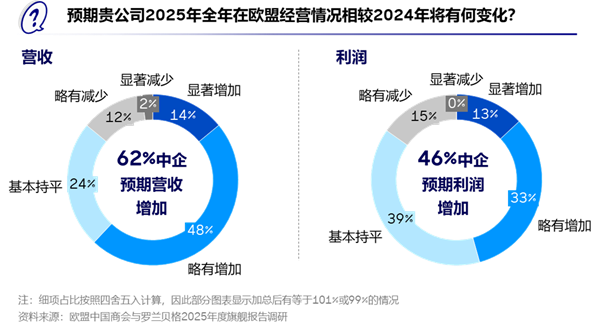 受访中企对2025年经营前景普遍乐观,预期增长成为主流。62%受访企业预计2025年营收实现增长,仅14%受访企业预估营收减少。利润维度同样呈现积极态势,46%受访企业预计2025年利润提升,39%预计保持平稳。