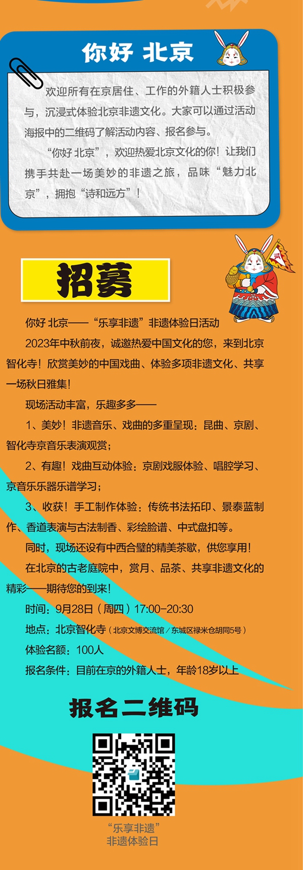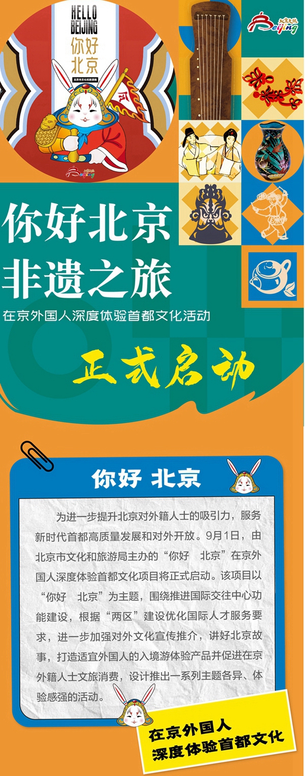 为进一步提升北京对外籍人士的吸引力,服务新时代首都高质量发展和对外开放,9月1日,由北京市文化和旅游局主办的“你好 北京”在京外国人深度体验首都文化项目正式启动。