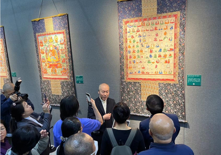 北京藏医院刘英华研究员为嘉宾介绍藏医唐卡展品