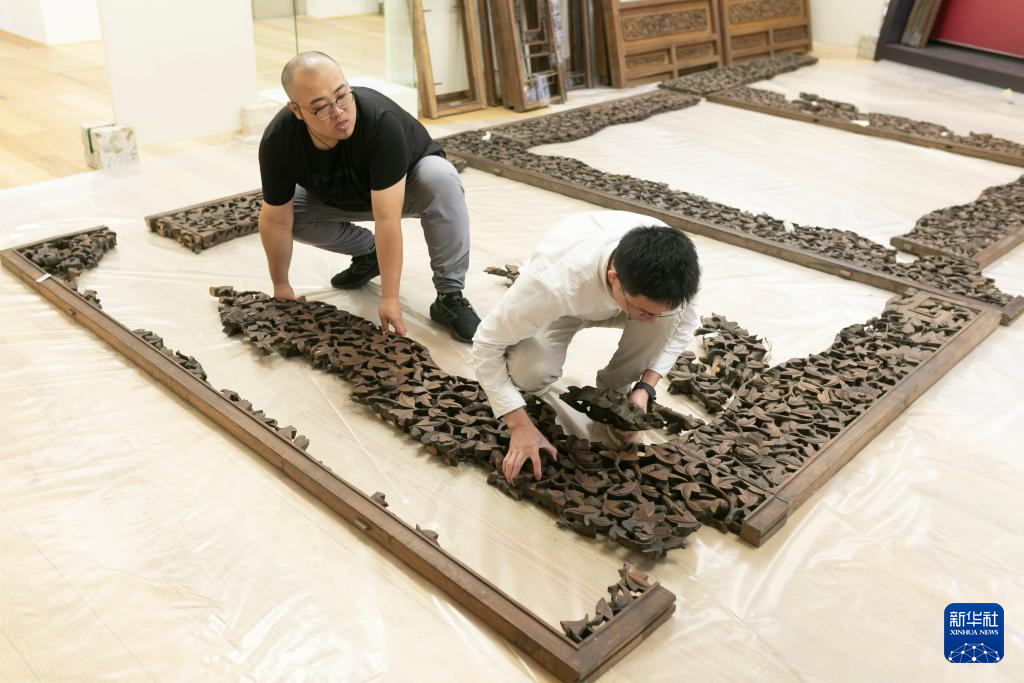 10月16日,在斯洛文尼亚卢布尔雅那的民族志博物馆,故宫博物院专家侯腾龙(左)、黄齐成修复中国古建筑室内装饰。新华社发(泽利科·斯特凡尼奇摄)