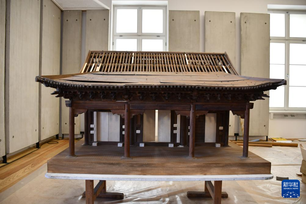 这是11月6日在斯洛文尼亚卢布尔雅那的民族志博物馆拍摄的修复完成的中国古建筑木质大门模型。新华社记者 周玥 摄