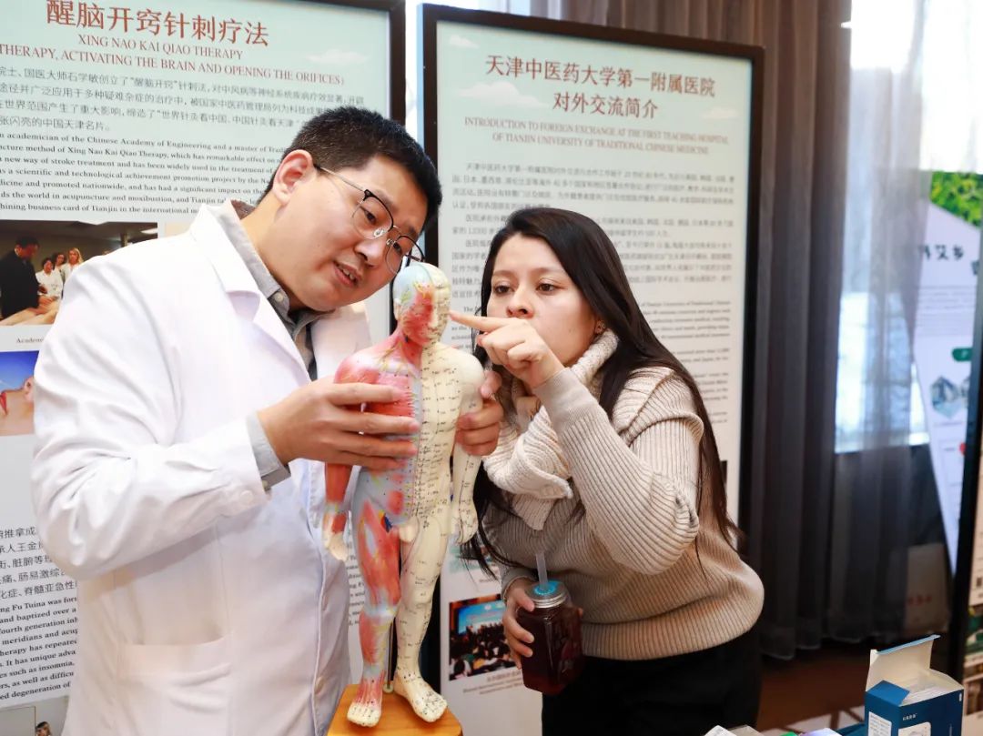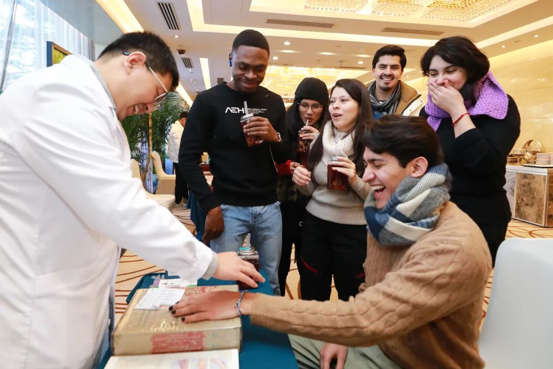 活动开始前,中外嘉宾一同参观中医药文化展览,深入了解中医药领域的非物质文化遗产,并进行现场体验