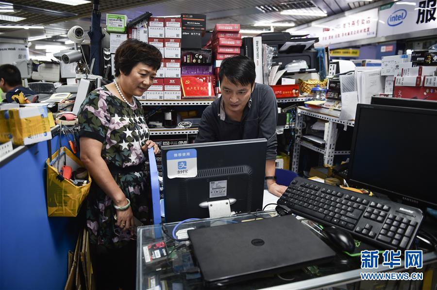 倪海真(左)到深圳华强北赛格电子市场五层的支部宣传委员陈亚林柜台前,与他沟通近期支部党员学习的情况(2017年9月5日摄)。新华社记者 毛思倩 摄